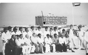 The two teams, Left to right back row standing.; 1 Madan Lal, 2 &3 Indian players, 4. Sri Lankan Captain, 5. Hanumat Singh, 6. S. Kirmani, 7. Ajit Wardeker (Former Indian Test Captain), 8 ?, 9. Ambassador to UAE Mansingh, 10. Mr Abdul Rehman Fazalnaq, 11. Captain Guddapa Vishwanath,12 &13 ?, 14 & 16 UAE official, 15 ?, 17 Ashok Mankad, 18 Mr Gandhi Dubai Cricket Association, 19. India’s fast bowler, Roger Binny, 20. Rusi Sorabji, 21 Official, 22 Chandru Bhan of the Lanchsire League, & two officials.