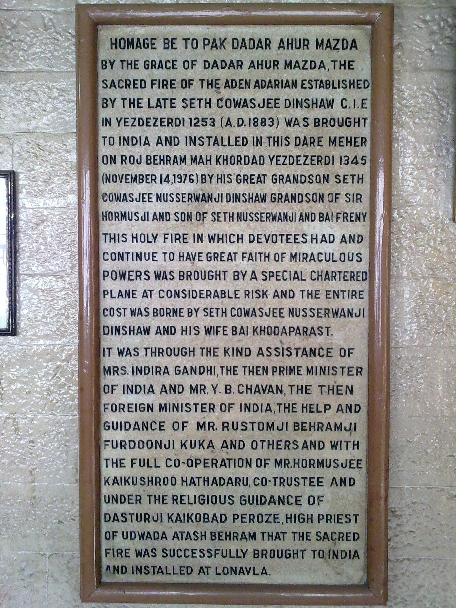 On 14th November, 1976, Roj Behram, Mah Khordad, Yz 1346, the Atash Padsha which was first consecrated in Aden in the year 1883 in the Adenwalla Agiary at Aden in Yemen, arrived at its new home, the Adenwalla Agiary at Lonavala, India.