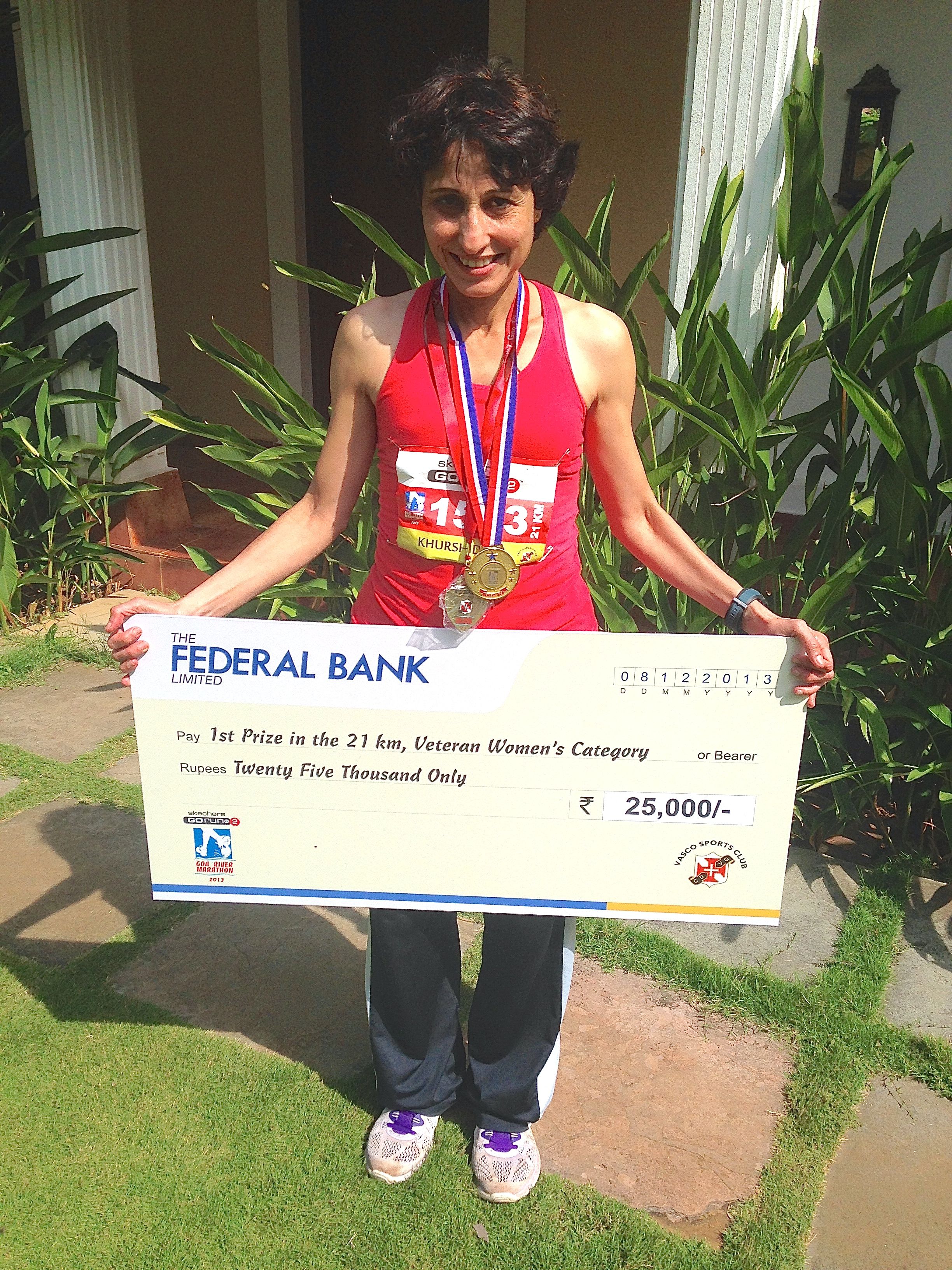 Khurshid has won the Goa River Marathon- 2013 in First Position under the Veteran Category which was held on December 8, 2013. She completed 21 kms in 1 hour 54 minutes.