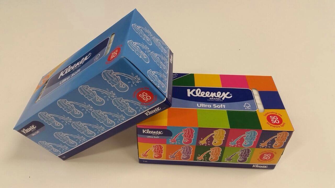 Recently, in conjunction with Singapore’s Jubilee Year, Kimberly-Clark S’pore Pte. Ltd. & SOTA organised a ‘Kleenex Celebrates SG50 Contest’ to select artworks to be used for Kleenex’s SG50 Facial Tissue Box. The winning design was created by Rukshana and these SG50 Facial Tissue Box’s are now available for sale in stores across S’pore.