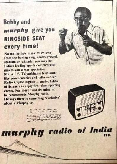 It’s interesting that Talyarkhan endorsed the Murphy Radio. My family had one. It ran on valves and had a Green Magic Eye that would glow when the radio was ready to receive audio frequency signal. The radio had two bands: Medium Wave and Short Wave. Both run by All India Radio. Medium Wave was Vividh Bharti. Its lineup was Hindi film music. More than music, it was cricket commentary that was followed on the radio. The live, ball-by-ball broadcast took the game to the masses. Conveying the roar of the stadium among runs and the silence in between wickets. Old timers miss Talyarkhan’s wit and wisdom still when there’s satellite television that colourfully brings cricket live to our homes from around the world.”