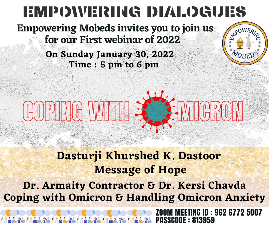 Omicron has brought with it it renewed challenges, come hear Dasturji Khurshed K. Dastoor uplift us with a message of hope, renowned Dr. Armaity Contractor speak of coping with Omicron and Dr Kersi Chavda one of our leading Mental Health practitioners, give tips on handling COVID stress and anxiety.