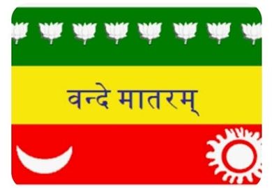 The green, yellow and red represent Islam, Hindu and Buddhism. The crescent moon and the sun also represent Islam and Hinduism. The 8 lotuses are the 8 provinces of British India. The words in the middle are in Devanagari script, Vande Mataram- we bow to you Mother India – the slogan of the Indian National Congress.