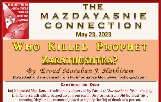May 23, 2023, Roj Khorshed Mah Dae, was observed by Parsis as ‘Zarthosht no Diso‘. Diso comes from Old Gujarati ‘disi’, meaning ‘day’ and is commonly used to signify the Roj of death of a person. Thus, Zarthosht no Diso marks the day that Asho Zarathushtra passed away from earth.