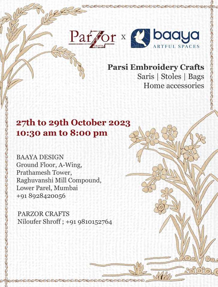 Parsi Embroidery Crafts Exhibition in Mumbai Posted on 16 October, 2023 by yazdi Leave a comment Saris, Stoles, Bags, Home Accessories from Parzor Crafts in Mumbai on 27-29 October 2023 Share this: Print (Opens in new window) Print Email a link to a friend (Opens in new window) Email Share on X (Opens in new window) X Share on Facebook (Opens in new window) Facebook More Share on Reddit (Opens in new window) Reddit Like this:Like Loading... Arts & Culture Calendar Latest