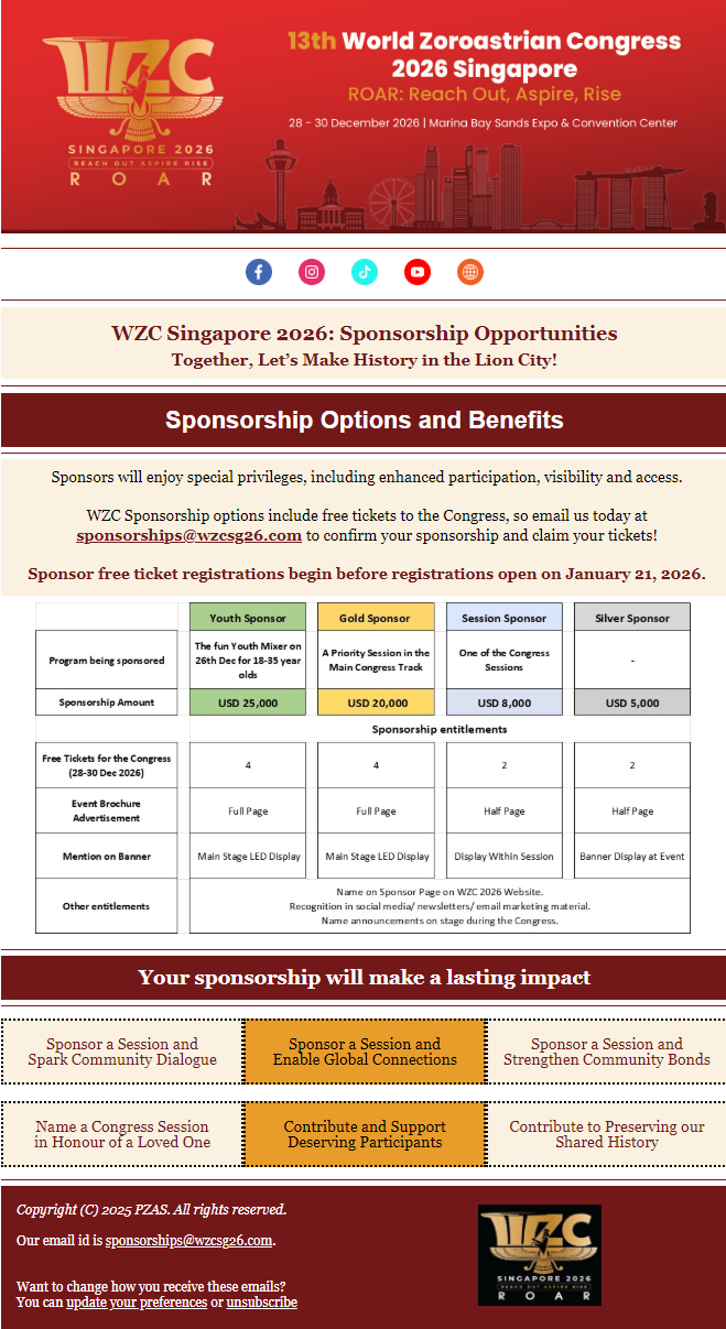 World Zoroastrian Congress – Sponsorship Opportunities Posted on 11 January, 2026 by yazdi Leave a comment Share this: Click to print (Opens in new window) Print Click to email a link to a friend (Opens in new window) Email Click to share on X (Opens in new window) X Click to share on Facebook (Opens in new window) Facebook More Click to share on Reddit (Opens in new window) Reddit Like this:Like Loading... Latest WZCongress