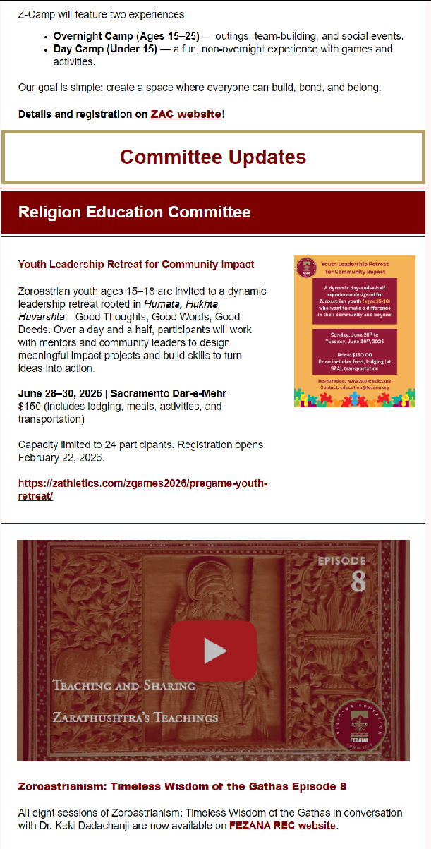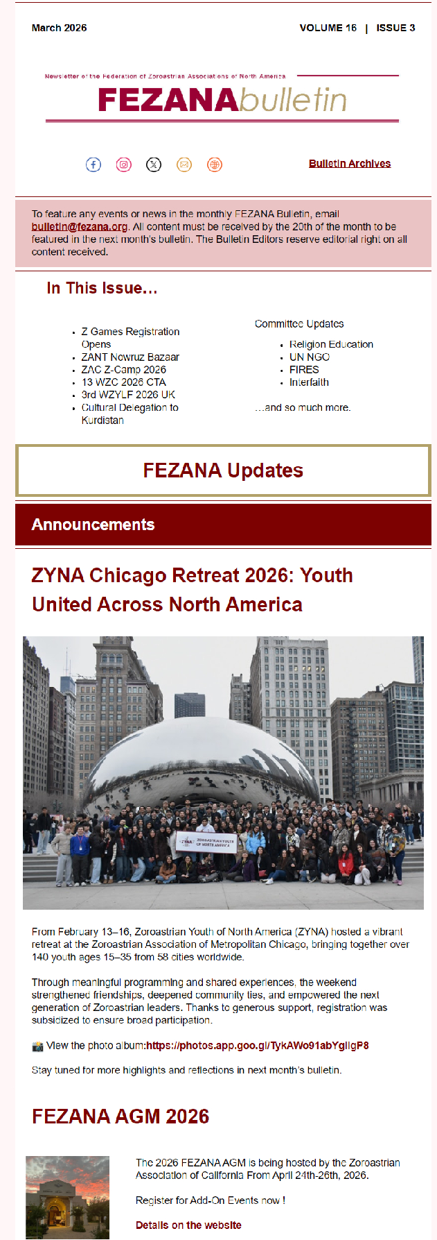 FEZANA Bulletin – March 2026 Posted on 4 March, 2026 by yazdi Leave a comment Share this: Print (Opens in new window) Print Email a link to a friend (Opens in new window) Email Share on X (Opens in new window) X Share on Facebook (Opens in new window) Facebook More Share on Reddit (Opens in new window) Reddit Like this:Like Loading... Federations/Associations Latest Newsletters